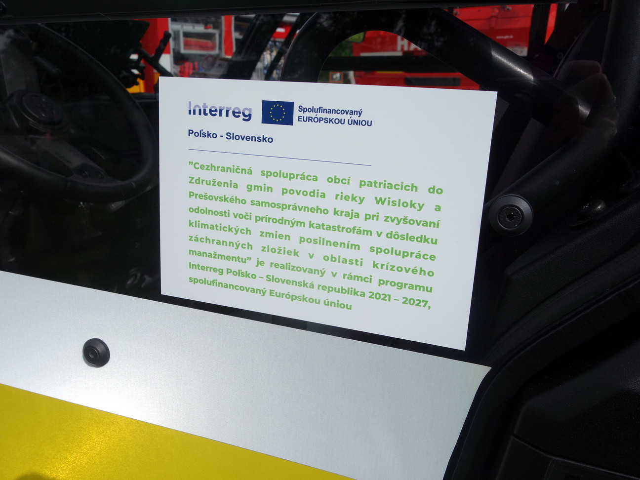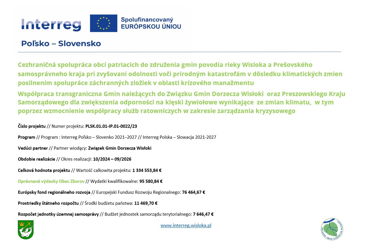 „Cezhraničná spolupráca obcí patriacich do združenia gmin povodia rieky Wisloka a Prešovského samosprávneho kraja pri zvyšovaní odolnosti voči prírodným katastrofám v dôsledku klimatických zmien posilnením spolupráce záchranných zložiek v oblasti krízového manažmentu“, číslo projektu PLSK.01.01-IP.01-0022/23.